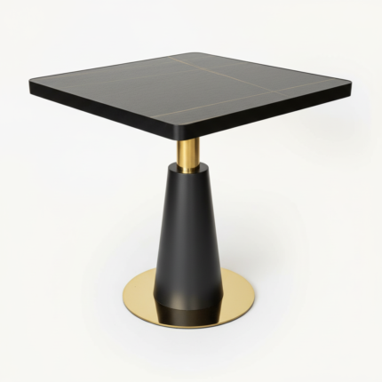 The Aurelian is defined by its striking two-tone aesthetic. It features a streamlined, square tabletop in a deep Obsidian Black matte finish, providing a sophisticated and durable surface for dining or display. This is elevated by a slender, high-shine gold pedestal and a matching weighted square base, creating a balanced silhouette that exudes “quiet luxury”.